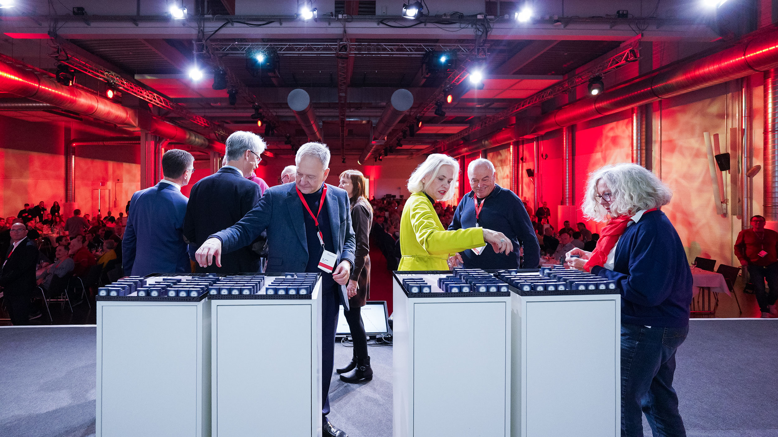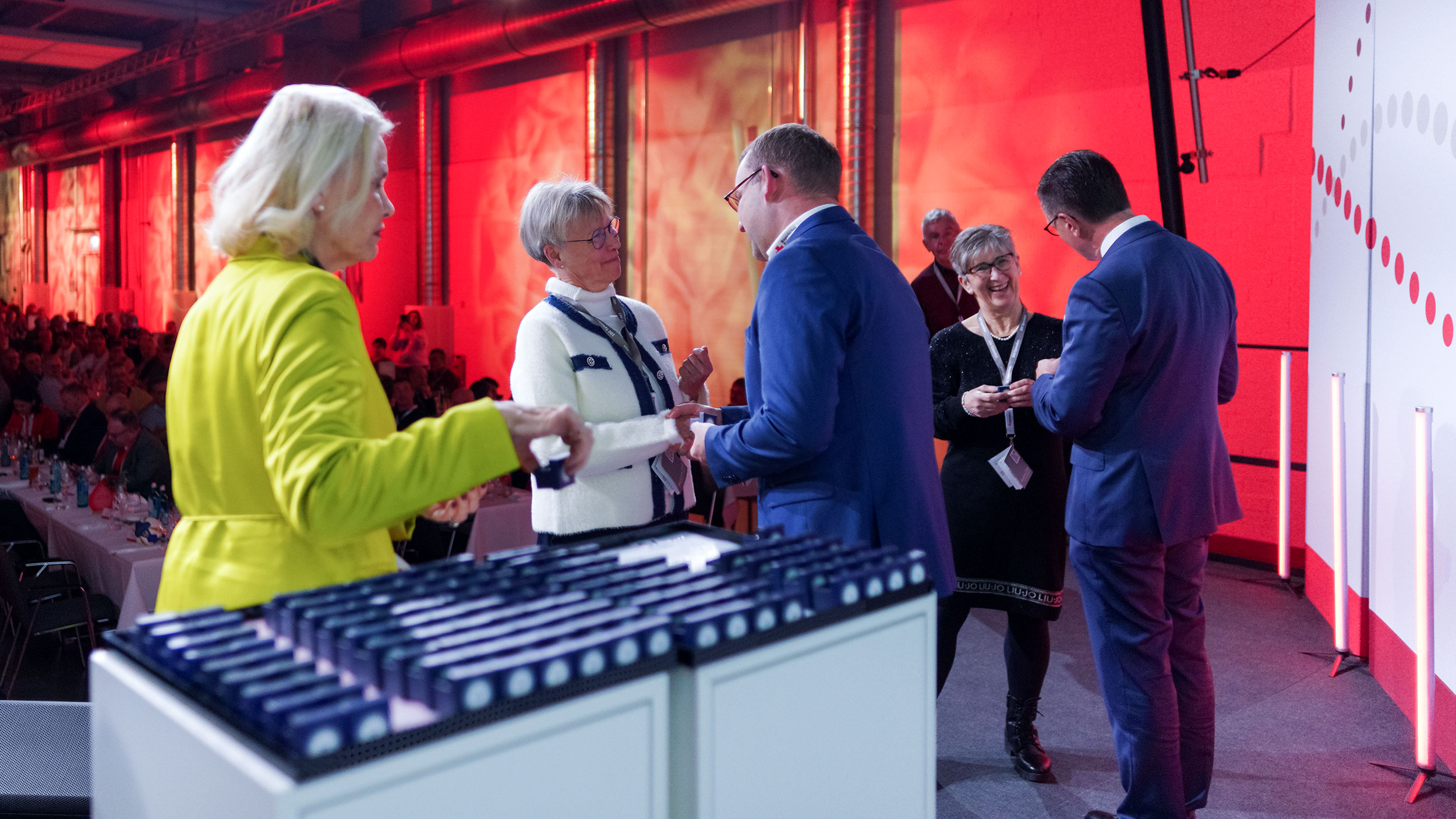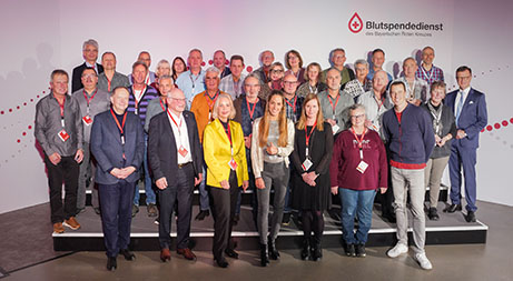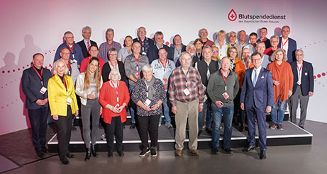 Im Anschluss erhielten alle anwesenden Jubilare ihre persönliche Auszeichnung. Diese wurde von den gastgebenden BSD-Geschäftsführern Georg Götz und Prof. Dr. Axel Seltsam, der Regierungspräsidentin von Unterfranken Dr. Susanne Weizendörfer, dem Vorstandsvorsitzenden des BRK-Bezirksverbands Unterfranken Dr. Bernd Weiß sowie den Funktionärinnen und Funktionären der jeweiligen BRK-Kreisverbände überreicht. Als die drei Rekordspender des Abends für ihre sagenhaften 225 geleisteten Blutspenden auf die Bühne gebeten wurden, honorierte der gesamte Saal diese sagenhafte Zahl mit stehenden Ovationen.
